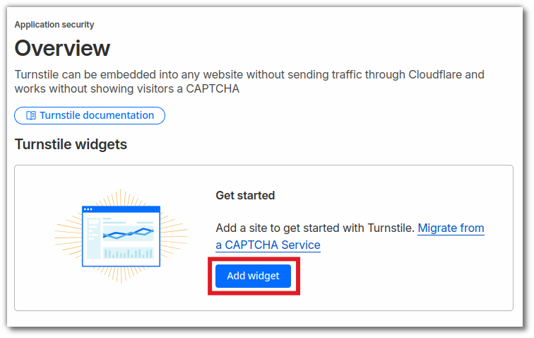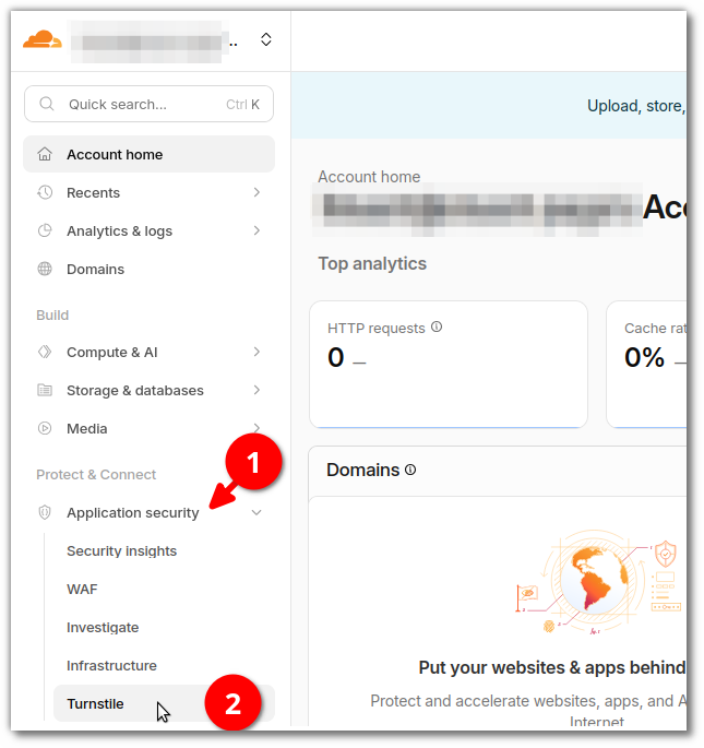 After logging into Cloudflare, go to Application security (1) and then Turnstile (2).