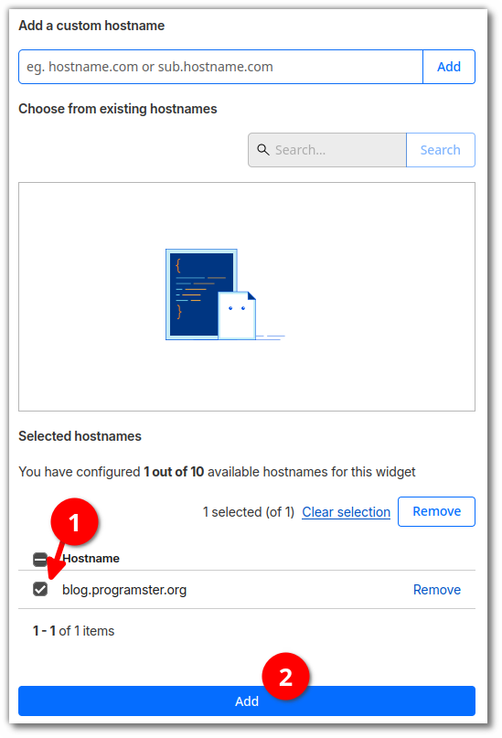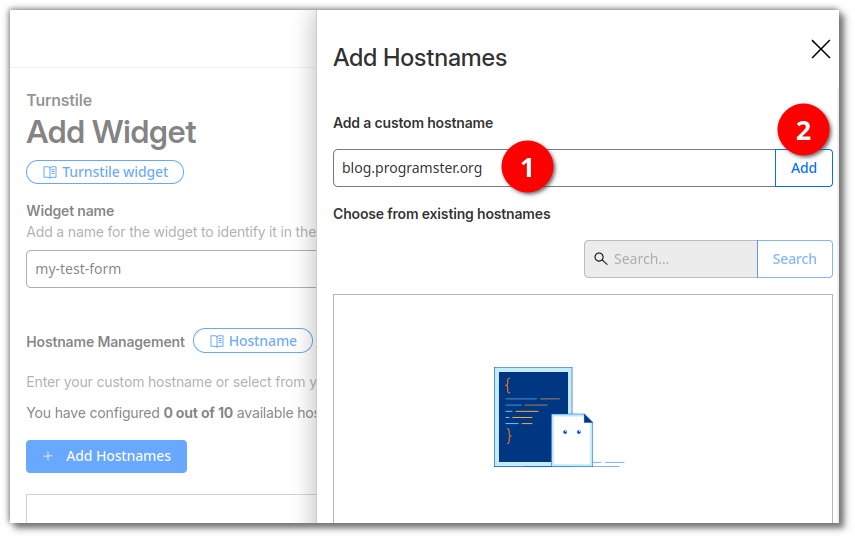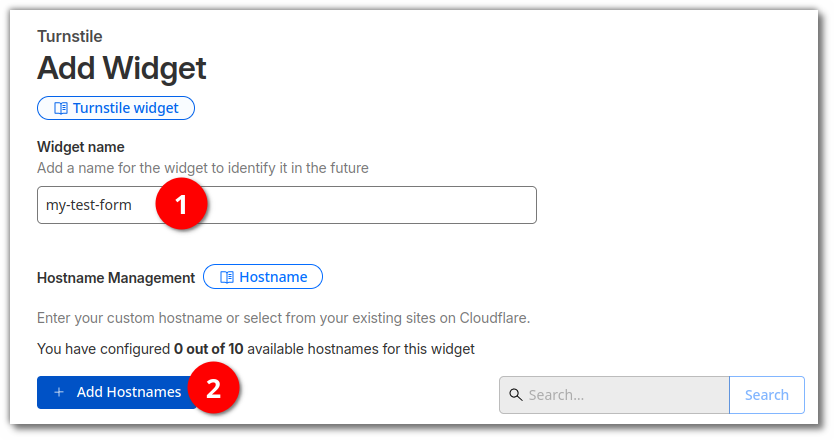 Give a name for your widget (which I would suggest be a name for your form), and then click Add Hostnames (2) for us to add the FQDN of our website.