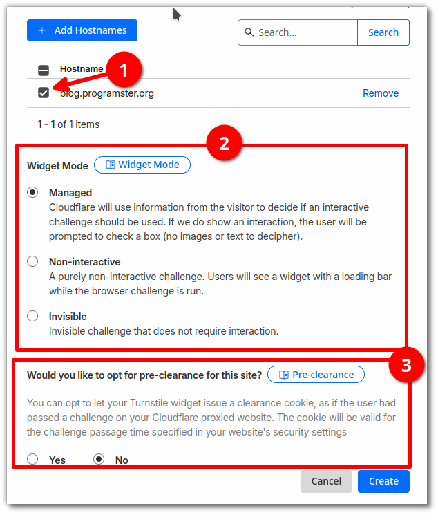 Now the panel will disappear, and your site's hostname should appear. Select it (1) and then select the Widget Mode (2). I would recommend leaving it on Managed to have the most effective solution (lowest rate of false positives). Then choose whether you would like to opt for pre-clearance on the site. Finally click the Create button.