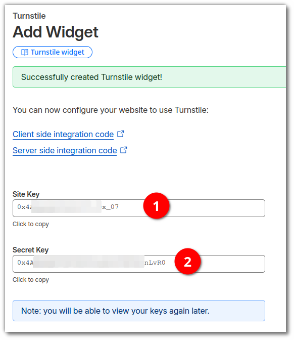 You will now be given your Site key and Secret. Copy these down and we will use them in the implementation steps further on.