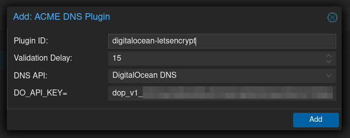 Now we need to configure proxmox with a plugin for using our DNS provider for Let's Encrypt certificate challnges.